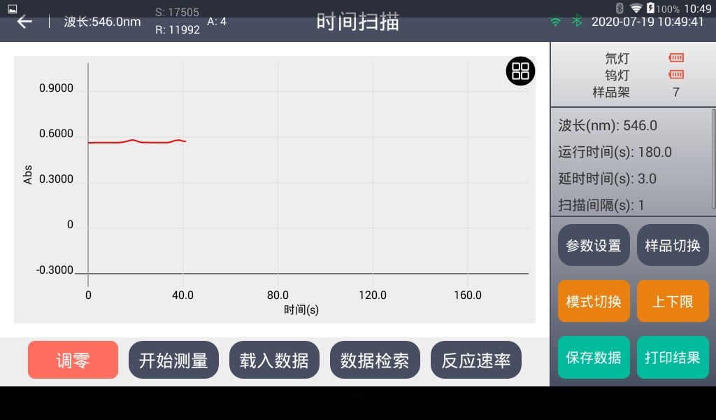 時(shí)間掃描——?jiǎng)恿W(xué)測量又名時(shí)間測量,用戶根據(jù)自己的樣品設(shè)定波長點(diǎn)對樣品溶液在設(shè)定的一定的掃描時(shí)間范圍內(nèi)每隔一個(gè)時(shí)間