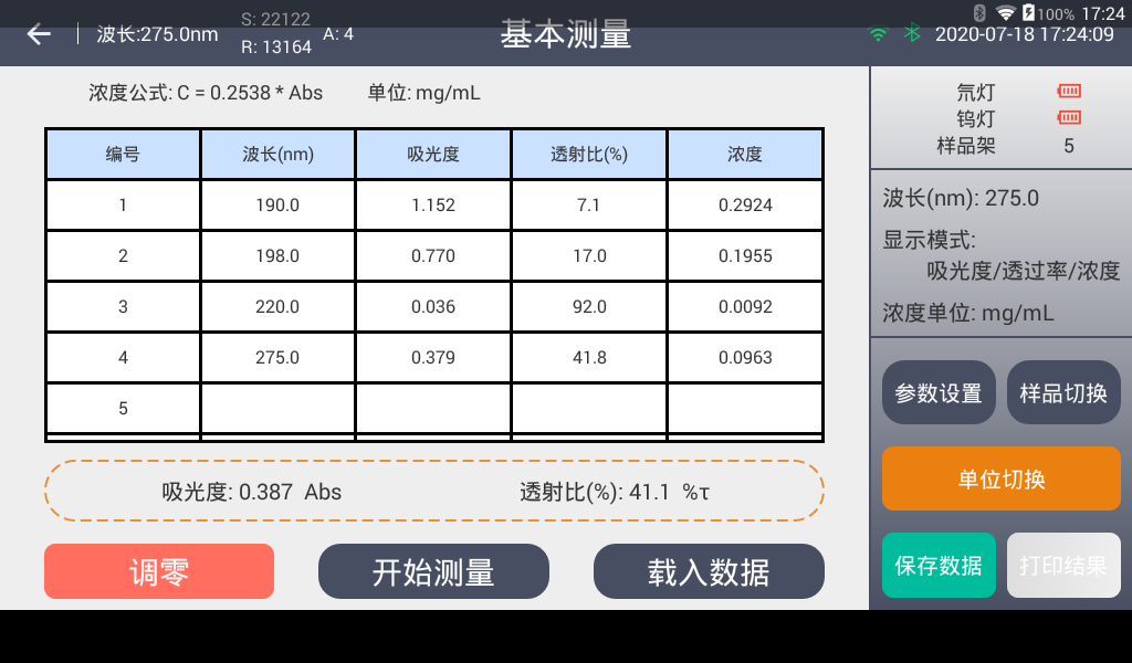 基本測量—— 輸入波長 測試該波長下的樣品含量值、可輸入樣品含量 測試未知樣品