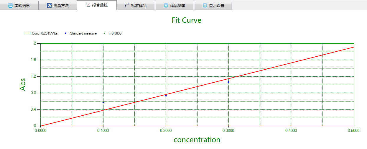 定量測量——進(jìn)行樣品的定量分析,可用多個(gè)標(biāo)準(zhǔn)樣品(兩個(gè)以上)建立波長的吸光度—濃度曲線,并由此曲線求得未知樣品濃度。